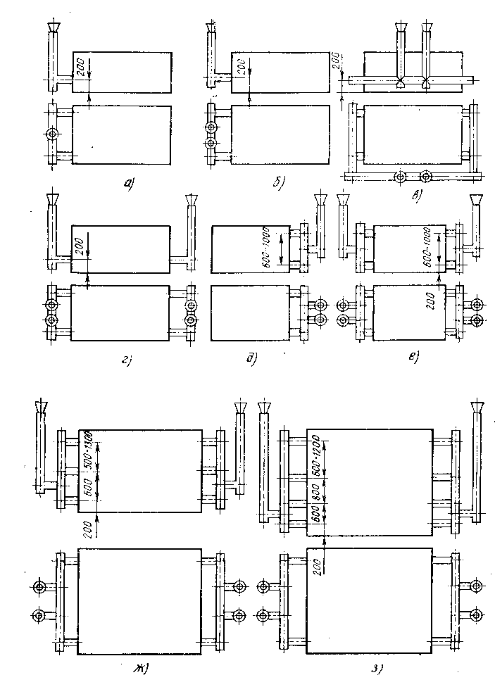 Для отливок прямоугольной формы одноярусные системы предусматривают: подвод металла с одной стороны отливки, заливку через один или два стояка (рис. 3, а, б); подвод металла двух сторон отливки, заливку из одного и двух ковшей (рис. 3, в,г). Двухъярусные системы предусматривают подвод металла с одной стороны, заливку через два стояка (рис. 3, д), подвод металла с двух сторон, заливку через три или четыре стояка из двух ковшей (рис. 3,е). Трехъярусные и четырехъярусные системы обеспечивают подвод металла с двух сторон, заливку через три или четыре стояка из двух ковшей (рис. 3, ж, з).
