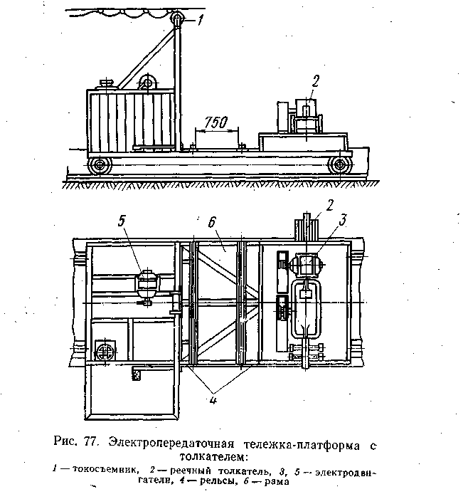 Для перевода вагонеток с одного рельсового пути на другой применяют электропередаточные тележки-платформы (рис. 77). Они состоят из рамы 6 с уложенными на ней рельсами 4, электродвигателя 5, токосъемника и реечного толкателя, 2, приводимого в движение электродвигателем 3.