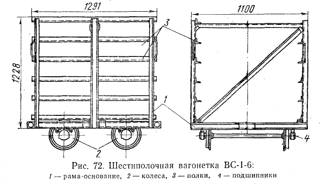 Шестиполочные вагонетки ВС-1-6 (рис.72) предназначены для внутризаводского транспортирования и сушки кирпича в туннельных сушилках. Они состоят из рамы-основания 1, установленной на подшипниках 4, двух пар колес 2 и уголковых полок 3, расположенных по шесть рядов на боковых стойках рамы.