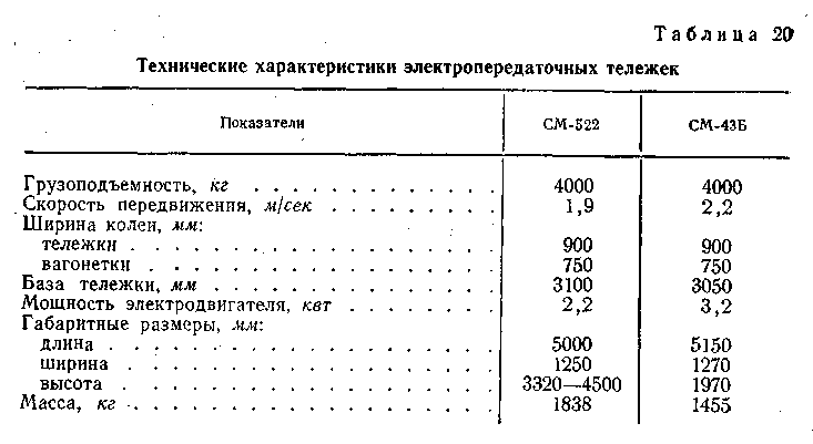 Для одновременного транспортирования двух вагонеток с кирпичом выпускают электропередаточные тележки СМ-522 без толкателя и СМ-43А (табл. 20).
