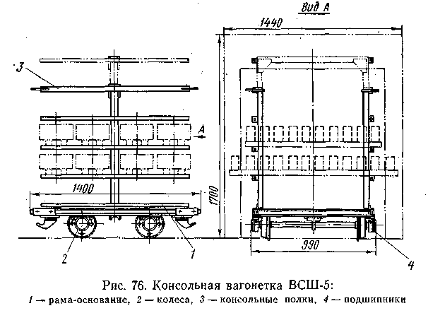 Консольные вагонетки ВСШ-5 (рис. 76) под автомат-укладчик состоят из рамы-основания , установленной на подшипниках 4, двух пар колес 2 и консольных полок 3, приваренных в одной точке по середине полки. Опорой для каждой полки является только одна из стоек.