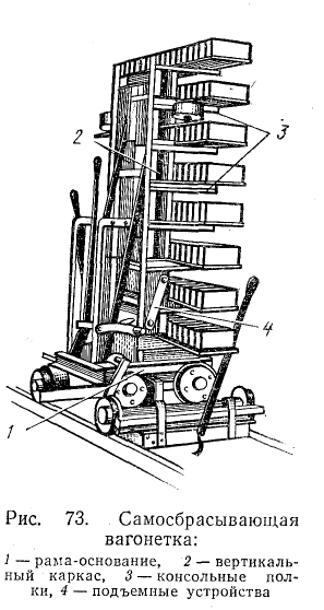 Само сбрасывающая вагонетка (рис. 73) состоит из рамы-основания 1, вертикального каркаса 2 из двух опор, включающего две подвижные вертикальные стойки, на которых крепят консольные полки 3, подъемного устройства 4.