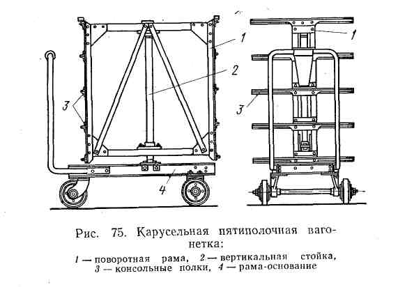 Карусельная пятиполочная вагонетка (рис. 75) состоит из рамы-основания 4, установленной на колеса, поворотной рамы, вертикальной стойки 2, консольных полок 3. Для передвижения вагонеток по бетонному полу на них устанавливают три колеса, одно из них поворотное; для передвижения вагонетки по рельсам — четыре стальных колеса. Пятиполочная карусельная вагонетка приближается к снижателю и снимает пять рамок с кирпичом. Рама снижателя под действием массы контргруза поднимается из приямка. Та же вагонетка поворачивается пустой частью полок, забирает остальные пять рамок с кирпичом и транспортирует их в печь.