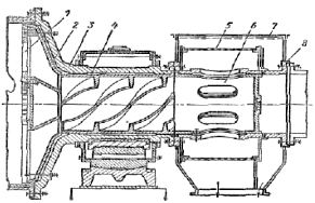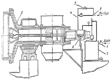 1 — розвантажувальна частина; 2 — камера помелу; 3 — камера сушка; 4 -- трубошнек; 6 - завантажувальна частина