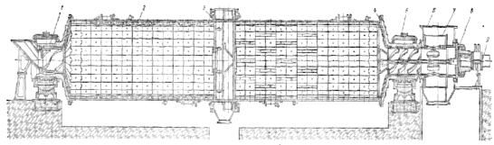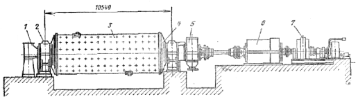1 — розвантажувальна частина; 2 — барабан; 3 — підшипник; 4 — завантажувальна частина; 5 — тихохідний електродвигун головного приводу; 6 - редуктор допоміжного приводу; 7 - змащувальна система