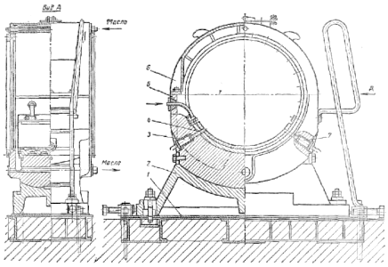 Підшипник (мал. 9) складається з рами, корпусу підшипника, корпусу вкладиша, вкладиша з бабітовою заливкою і кришки. Рама корпусу зварна; при монтажі заливається в бетонний фундамент млина. Корпус підшипника і корпус вкладиша литі і сполучаються по сферичних поверхнях, що забезпечує самоустановку підшипника при роботі млина. Вкладиш з бабітовою заливкою має водяне охолоджування і виконаний з кутом обхвату цапфи 120°. У вкладиші встановлені термодатчики для контролю за температурою бабітової заливки. Кришка підшипника зварна з листової сталі, кріпиться до корпусу вкладиша болтами. У верхній частині її є патрубок, через який підводиться масло.