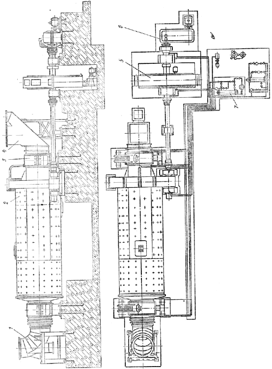На мал. 13 показаний подовжній розріз млина 3,2x8,5 м по барабану. Млин оснащений двома завантажувальними пристроями і розвантажувальними пристроєм 5 тим, що знаходяться в середній частині барабана. Один завантажувальний пристрій розташований з торця, протилежного приводу (лівий), інше (правий) знаходиться з боку приводу. Лівий завантажувальний пристрій призначений для подачі матеріалу і гарячих газів в млин. Воно складається із зварної тічки з патрубком, барабана і кришки торця з порожнистою цапфою, в яку вмонтований трубошнек.