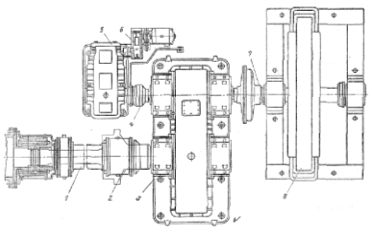 1 — проміжний вал; 2 — зубчата муфта; 3 — редуктор головного приводу; 4 — обгінна муфта допоміжного приводу; 5, 6 — редуктори допоміжного приводу; 7 — еластична муфта; 8 — електродвигун головного приводу