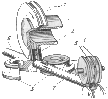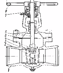 Рис.1 Задвижка: 1-корпус; 2-тарелка; 3-обойма; 4-тарелкодержатели; 5-шпиндель; 6-крышка; 7-втулка; 8-маховик.