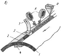 Рис.3 Электродуговая сварка: а - дуговая сварка труб в защитном газе: 1 - трубная заготовка; 2 - сжимающие валки; 3 - сварочная горелка; б - автоматическая сварка под слоем флюса: 1 - труба; 2 - сварной шов; 3 - шлак; 4 - медный башмак, 5 - подача флюса; 6 - сварочная головка; 7 - отсос избыточного флюса