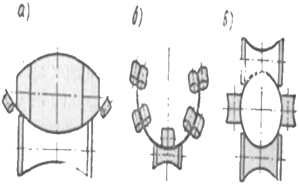 Рис.1 Схема формирования трубной заготовки на непрерывных валковых станах: а, в - валковые калибры; б - роликовый калибр