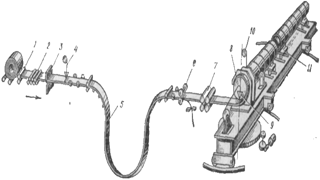 Рис.4 Схема стана спирально-шовных труб: 1 - разматыватель; 2 - правильная машина; 3 - ножницы для обрезки концов полосы; 4 - автомат для сварки стыков полосы; 5 - петлевое устройство; 6 - дисковые ножницы для обрезки кромок; 7 - подающая машина; 8 - формовочное устройство; 9 - автомат для внутренней сварки; 10 - автомат для наружной сварки; 11-отводящий рольганг