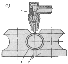 На рис.2 приведена схема контактной электросварки труб сопротивлением. Электрический ток подводится к кромкам заготовки с помощью сварочного устройства, состоящего из электродных колец 1, разделенных между собой изолятором 2, которые - являются вторичной обмоткой вращающегося сварочного трансформатора. Стык кромок сформованной трубной заготовки, который попадает в зазор между электродными кольцами, нагревается. Под давлением сжимающих сварочных валков и сварочных электродов кромки трубы свариваются.