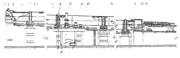 Основной элемент печи - железный барабан 3 длиной до 150 м и диаметром 2,0—3,8 м. Барабан футеруется высокоглиноземистым или шамотным кирпичом. Печь работает по принципу противотока. Шихта сухая или мокрая в виде пульпы с содержанием влаги 40 - 42% поступает в барабан через торец 6 (холодным конец) и медленно перемещается к головной части 2 (горячий конец) навстречу газам. Из барабана продукт спекания – спек - ссыпается в холодильник, расположенный под печью и представляющий собой также барабан длиной до 30 м и диаметром до 2,5 м. В барабане спек охлаждается движущимся навстречу воздухом или водой, орошающей холодильник сверху. При охлаждении спека воздухом последний просасывается через холодильник вентилятором (на рисунке не показан) и используется при сжигании топлива. Для нагрева печи применяют мазут, газ или угольную пыль. Форсунки или горелки располагают в головной части барабана. Дымовые газы, содержащие значительное количество пыли, через дымоход 8 направляются на очистку в пылевые камеры, в электрофильтры и даже иногда в скрубберы. Только после этого дымовые газы с помощью дымососа отводятся в дымовую трубу. Футерованный и загруженный шихтой барабан имеет большую массу (масса печи длиной 70 м около 400 т). С помощью специальных бандажей 4, закрепленных снаружи кожуха, печь опирается на вращающиеся ролики 11 с бронзовыми подшипниками. Вращение производится от мотора 10 через редуктор и венцовую шестерню 5, укрепленную с помощью пружин на кожухе печи. Барабан вращается обычно с частотой 0,0—2 оборота в минуту. Частоту вращения можно изменять, регулируя контроллером число оборотов мотора.