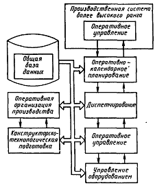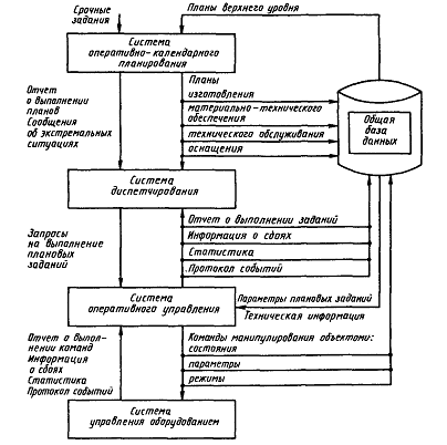 Такая иерархия характерна для производственной системы любого ранга. На уровне завода система оперативного управления при управлении транспортной системой выполняет функции управления межцеховыми перевозками, при управлении складской системой она поддерживает состояние общезаводских запасов комплектующих, сырья и объем неотгруженной готовой продукции в заданных пределах, при управлении технологической системой — функции координации работы цехов, на уровне цеха при управлении транспортной системой — функции управления внутрицеховыми перевозками, при управлении складской системой — управление работой общецеховых складов, при управлении технологической системой обеспечивает выполнение маршрутов обработки изделий, поддерживает синхронизацию отдельных этапов технологических процессов, на уровне участка при управлении транспортной системой управляет транспортировкой между рабочими модулями участка, при управлении технологической системой координирует работу модулей. Таким образом, функции системы оперативного управления, как и для других уровней иерархии управления, интерпретируются аналогично. При этом уровень оперативного управления завода взаимодействует с уровнем планирования цехов и так далее. Этим обеспечивается целостность всей системы управления.