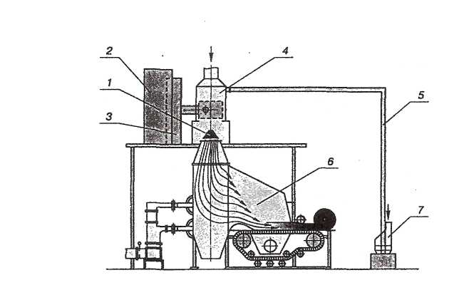 Рис. 1. Схема технологической линии для производства базальтового волокна: 1 - плавильный комплекс «Базальт»; 2 - механизм загрузки; 3 -устройство дутьевое; 4 - камера волокноосаждения; 5 - фильтр; 6 -вентилятор; 7 - ковер минераловатный
