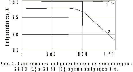 Как видно из рис. 3, вата БСТВ имеет высокую виброустойчивость, которая при 900 °С составляет 99,65 % [6]. Виброустойчивость определяется прежде всего длинноволокнистой структурой ваты, а также характером кристаллизации, обусловливающим достаточное сохранение эластичных и прочностных свойств ваты. Вследствие этого вата БСТВ при вибрации не разрушается. Базальтовая вата БВРВ того же состава, что и БСТВ, имеет меньшую вибростойкость. Потери в ее массе при 3-часовой вибрации в исходном состоянии равны 2 % и до 500 °С не изменяются. При дальнейшем повышении температуры до 900 °С потери в массе ваты резко возрастают и достигают 12%.