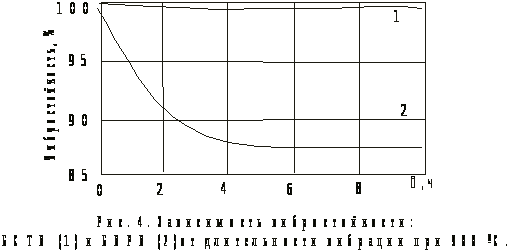 Для установления возможности применения базальтовой ваты в условиях вибрации и высоких температур была исследована ее вибростойкость. Установлено, что после вибрации при температурах 600, 700 и 800 °С разрушения волокон от вибрации не наблюдалось и потери в массе в основном происходили за счет "корольков" у ваты типа БВРВ и за счет первичных волокон у ваты БСТВ. Зависимость вибростойкости от температуры и времени воздействия вибрации показана на рис. 3 и 4.