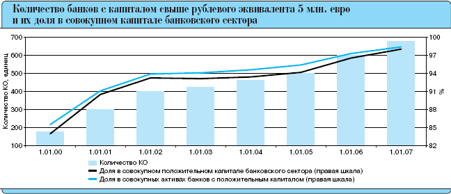 Количество кредитных организаций с капиталом свыше рублевого эквивалента 5 млн. евро увеличилось за 2006 год с 602 до 676, или на 12.3% (совокупный капитал этой группы кредитных организаций возрос на 38.4%), а их удельный вес в совокупном капитале банковского сектора повысился с 96.6 до 98%. Приложение 4.
