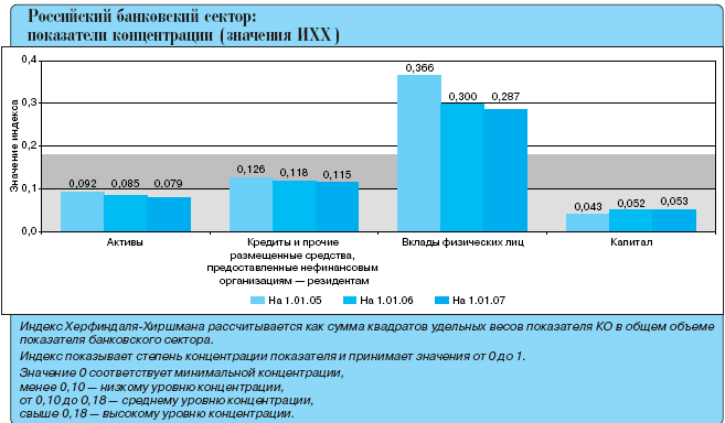 Так, индекс концентрации активов снизился с 0.085 на 1.01.2006 до 0.079 на 1.01.2007. концентрация кредитов нефинансовым организациям осталась на среднем уровне.