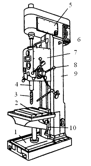 На рис. 3 показан одношпиндельный вертикально-сверлильный станок модели 2Н135А. На фундаментной плите 1 крепится станина 9. В верхней части станины расположен электродвигатель 6 мощность 4,5 кВт, который сообщает сверлу 3, укрепленному в нижней части шпинделя 4, главное движение резания D>r> (вращательное) через коробку скоростей, расположенную в консольной части станка, называемой шпиндельной головкой 5. Движение подачи Ds (поступательное вдоль оси) сверло получает от коробки передач, укрепленной в подвижном кронштейне 7.