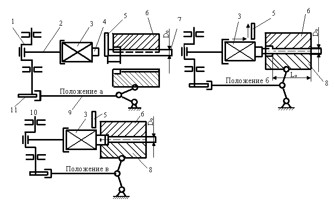Взаимодействие механизмов ГКМ и частей штампа в процессе штамповки осуществляется по следующей схеме (рис. 1). Заготовку-пруток 7 закладывают в зажимную часть ручья неподвижной матрицы 6 и подают вперед до упора 5. Часть прутка длиной Lв, выходящая за пределы зажимной части ручья, называется высаживаемой частью заготовки. Такое расположение механизмов машины, частей штампа и заготовки предшествует включению машины на рабочий ход и обозначено на схеме, как Положение а. Включением машины на рабочий ход механизмы и части штампа приводятся последовательно в Положения б и в. В начальной стадии поворота коленчатого вала 1 кулачок 11 через ролик 10 приводит в движение механизм 9. Зажимной механизм перемещает матрицу 8 в рабочее положение и осуществляет плотный зажим заготовки о длине Lз. После этого упор 5 отходит, а пуансон 4 приходит в соприкосновение с торцом прутка 7 (Положение б). При дальнейшем движении пуансона деформируется высаживаемая часть прутка, заполняя полость ручья (положение в). При обратном ходе машины из полости ручья удаляется пуансон 4, затем отходит матрица 8, а упор 5 устанавливается в исходное положение. Как только начинается отход подвижной матрицы, штамповщик вынимает пруток с высаженным концом из ручья и перекладывает в следующий ручей. Цикл повторяется.
