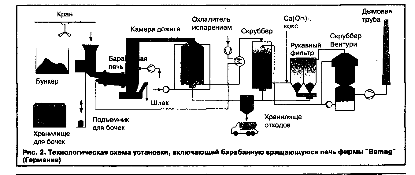 В мировой практике наиболее широко применяют термическое обезвреживание медицинских отходов во вращающихся барабанных печах. Технологическая схема включает в себя барабанную печь, камеру дожигания, котел-утилизатор, многоступенчатую систему очистки дымовых газов (рис.2). Следует отметить, что в технологическом отношении барабанные вращающиеся печи с жидким шлакоудалением являются наиболее универсальными термическими реакторами для переработки крупнокусковых отходов переменного состава.