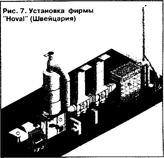 Многие применяемые в настоящее время печи характеризуются низкими экологическими показателями (выбросы вредных веществ в атмосферу, образование «грязного» шлака, содержащего остатки органических примесей), малым рабочим ресурсом и низкой интенсивностью процесса обезвреживания. Например, установка типа «СмартАш» фирмы «Эластик» (США) не имеет вообще блока очистки газов (рис.3). Некоторые фирмы выпускают установки с малоэффективной одноступенчатой очисткой газов, например установки фирмы «Михаэ-лис», Германия (рис.4) и фирмы «Dae Han Jung», Республика Корея (рис.5). Установки с более эффективной (двухступенчатой) очисткой газов (применяется тканевой рукавный фильтр и мокрый скруббер) производятся фирмой «Joseph Egli», Швейцария (Рис.6), и фирмой «Hoval», Швейцария, Лихтенштейн (рис.7).
