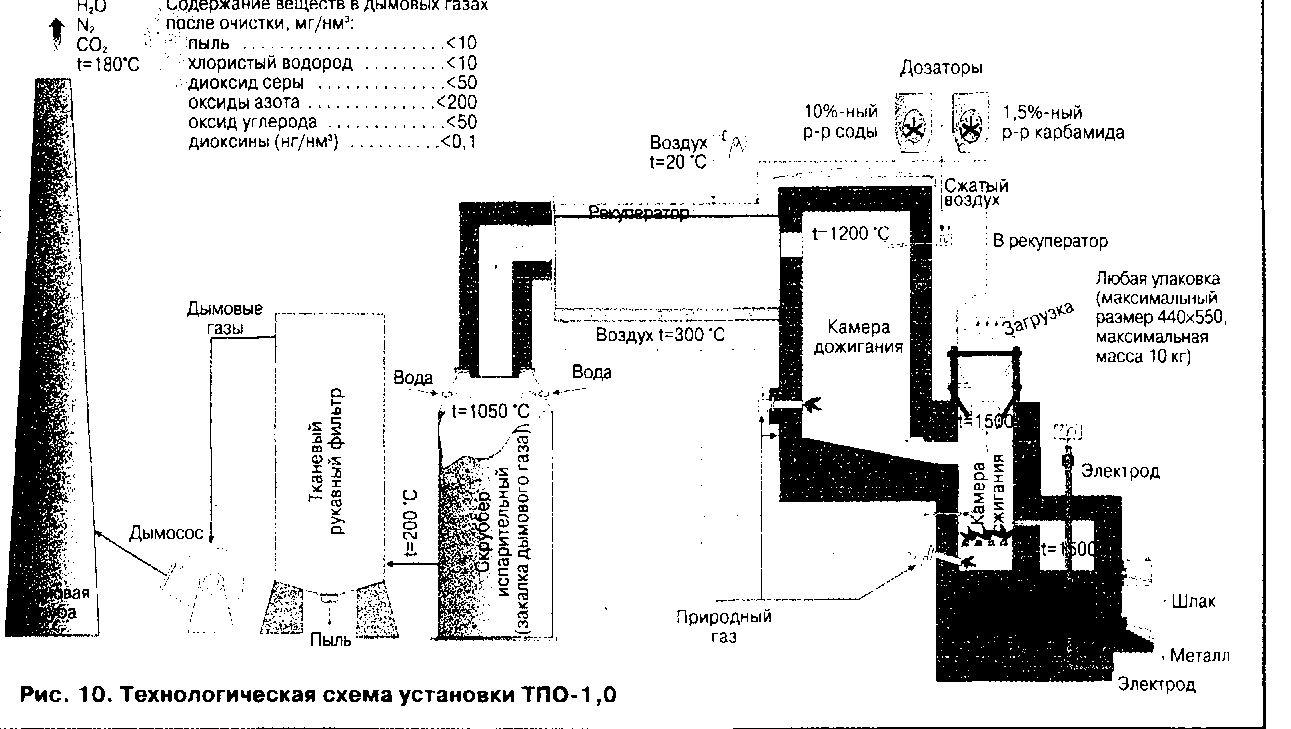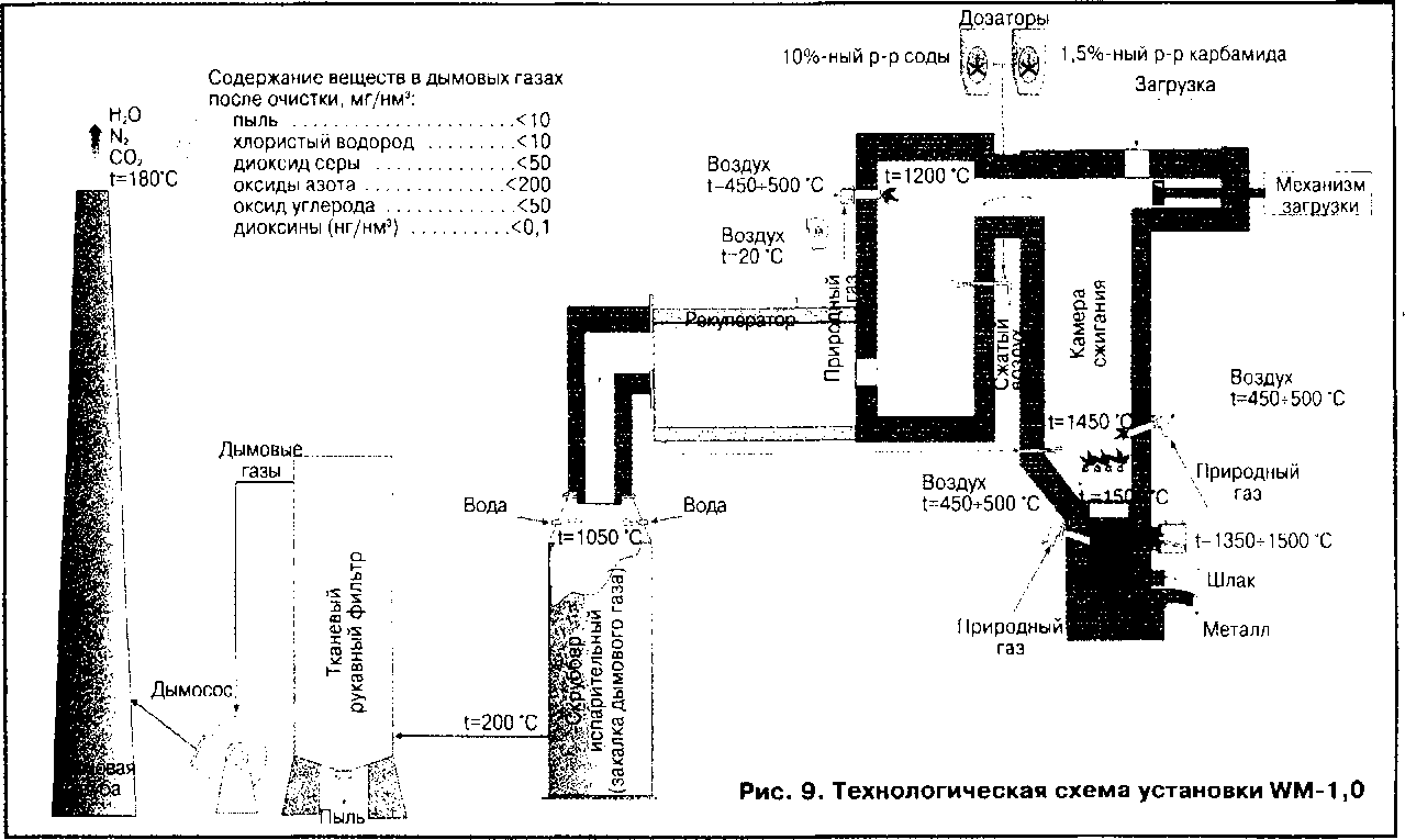 На рис.9 и 10 приведены технологические схемы установок, в которых проводится многоступенчатая очистка газа и выпуск стерильного шлака, что достигается при его расплавлении в огневом реакторе или в электродуговой печи (WM-1,0, разработка АО»ВНИИЭТО», АО «Стальпро-ект» и НПО «Техэнергохим-пром» и ТПО-1,0, разработка АО «ВНИИЭТО» и НПО «Техэнергохимпром»).