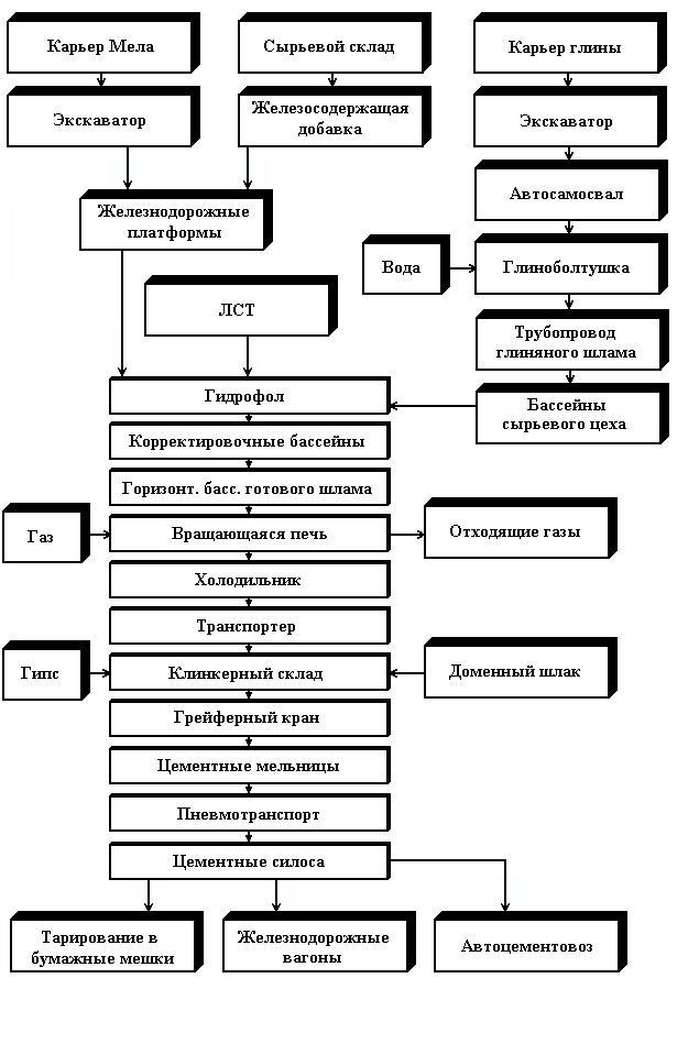 Сырьем при производстве цемента по мокрому способу являются следующие компоненты: карбонатный компонент - мел, силикатный компонент - глина, железосодержащие добавки - пиритные огарки, конверторный шлам, железистый продукт.