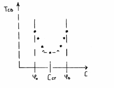 Рис.1.1 Зависимость температуры самовоспламенения (Тсв) от концентрации горючего в смеси (С).
