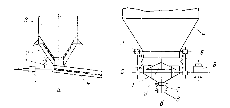 Рис. 2. Устройства для выгрузки материала из бункера: а — с аэрациокным рыхлителем; б — с двойным вибрирующим конусом.