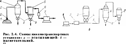 Пневматические транспортные установки (рис.4) могут быть всасывающими (вакуум-транспорт) и нагнетательными (пневмотранспорт). Принципиальной разницы между этими системами нет, поскольку в обоих случаях движущей силой является разность давлений на входе и на выходе из трубопровода, обеспечивающая нужную скорость воздушного потока.