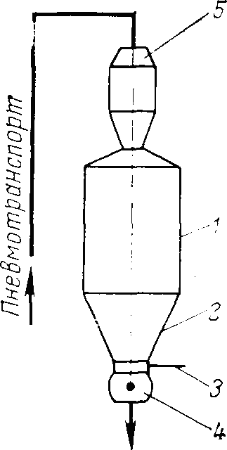 Основное оборудование, предназначенное для хранения сыпучих ингредиентов, составляют бункера (силосы), которые в зависимости от назначения подразделяются на бункера складского хранения и расходные бункера систем автоматического дозирования. Емкость и число бункеров, устанавливаемых на заводском складе, определяется мощностью предприятия, поскольку запас сырья на складе должен обеспечивать 10—15-суточную работу предприятия. Емкость бункера составляет от 100 м3 и более. Обычно бункер складского хранения (рис. 1) представляет собой сварной цилиндр / из листового дюралюминия диаметром около 5 м и высотой 10—15 м. К нижней части цилиндра приваривается коническое днище 2. Отверстие в днище диаметром примерно 1 м перекрывается шлюзовым затвором 3, через который материал поступает к питателю 4. Верхняя часть цилиндра перекрывается конической крышкой, внутри или над которой располагается циклон-отделитель 5 системы пневмотранспорта. Контроль за уровнем находящегося в бункере сырья может производиться с помощью радиационных уровнемеров или по весу с помощью тензометрических силоизмерителей, определяющих нагрузку в опорных стойках бункера. Угол наклона стенок днища бункера не должен превышать 20° по отношению к вертикали во избежание сводообразования и зависания в нем сыпучего сырья.