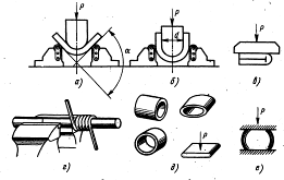а изгиб на определенный угол, б изгиб до параллельности сторон, в — изгиб до соприкосновения сторон, г — на навивание, д — на сплющивание труб, е - на осадку