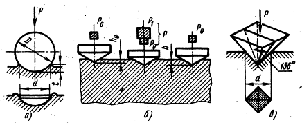 Рис. 10. Определение твердости металла методами Бринеллн (а), Роквелла (б) и Виккерса (в)