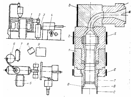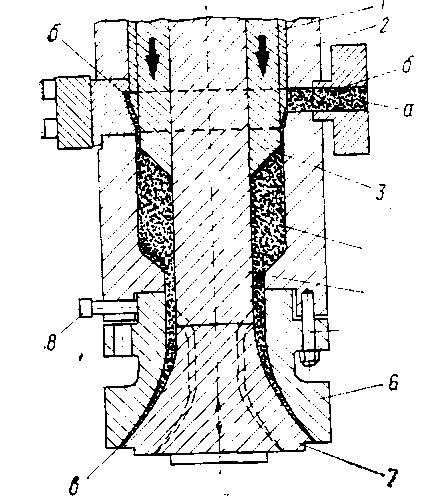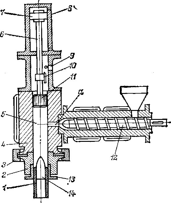 Расплав, поступающий из экструдера по центральному каналу а, проходит в кольцевое пространство б, откуда он перетекает под кольцевой поршень 3, соединенный тремя штангами с поршнем гидроцилиндра впрыска (на схеме не показаны). Под давлением расплава поршень смещается вверх, причем величина смещения определяется заданным — 5 объемом заготовки. При выдавливании заготовки гидроцилиндр перемещает поршень вниз, продавливая расплав через кольцевой канал в между коническим наконечником 7дор-на 4 и матрицей 6, укрепленной на корпусе головки 2 при помощи шпилек 5.