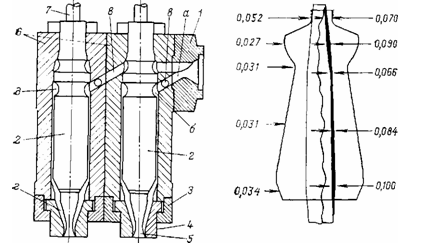 Рис. 8.4 Двухручьевая пинольная головка. Заготовка с программным изменением толщины стенок. Числа — значения толщины стенок заготовки (справа) и изделия (слева) в мм.