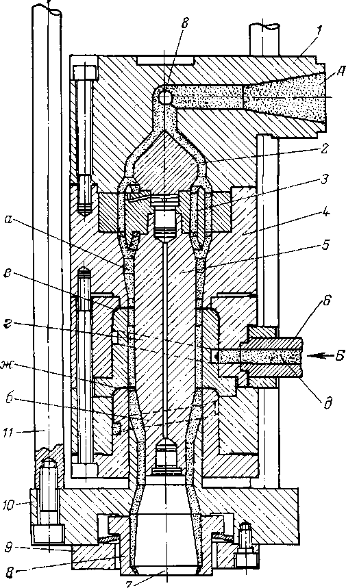 Расплав А, формующий наружный и внутренний слои, поступает от одного из экструдеров через соединительный патрубок / и, попадая в головку, делится на два потока. Один из них проходит по центральному каналу и направляется к коническому рассекателю 2, установленному на перфорированном дорнодержателе 3. Проходя через отверстия в дорне дорнодержателя, расплав попадает в кольцевое пространство а, образованное внутренней поверхностью корпуса головки 4 и наружной поверхностью дорна 5. Эта кольцевая струя формирует внутренний слой заготовки. Расплав Б, из которого формируется промежуточный слой, поступает в головку от второго экструдера через патрубок 6 по каналу д и, попадая в фигурный кольцевой канал г, образует кольцевую струю, которая пс кольцевой щели е выдавливается на поверхность ранее сформированной струи первого расплава. Сформировавшийся двухслойный поток поступает к щели ж, через которую на его поверхность выдавливается третий внешний! слой, подаваемый к щели ж через боковые каналы в и спиральный кольцевой канал б. Сформированная трехслойная струя выдавливается через формующий зазор между наконечником дорна 7 и матрицей 8, закрепленной при помощи фланца 9 на подвижном стакане 10, который установлен на колонках 11, соединенных с поршнем механизма программного регулирования зазора между матрицей и наконечником дорна.