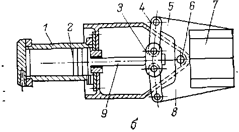 Шарнирный механизм смыкания (рис. 8.12,6) состоит из двух рычагов 5 и 8, укрепленных на оси 6. На каждом из рычагов укреплена полуформа 7. Серьгами 4 рычаги соединяются с сухарем 3, установленным на штоке 9. Поршень 2 лневмоцилиндра 1, укрепленный на штоке 9, предназначен для открытия и закрытия формы. При ходе поршня влево сухарь 3 увлекает; за собой серьги 4, при этом рычаги 5 и 8 поворачиваются и раскрывают форму. При обратном ходе поршня форма закрывается.