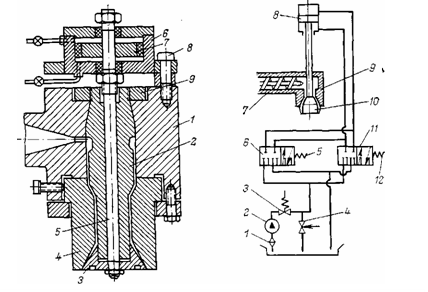 Рис. 8.7. Гидравлическая схема управления перемещением дорна: 1— фильтр; 2— гидронасос; 3 — предохранительный клапан; 4 — вентиль; 5, 12 — управляющие электромагниты; 6, 11 — золотники управления; 7 — экструдер; 8 — гидроцилиндр; 9 — головка; 10 — дорн.