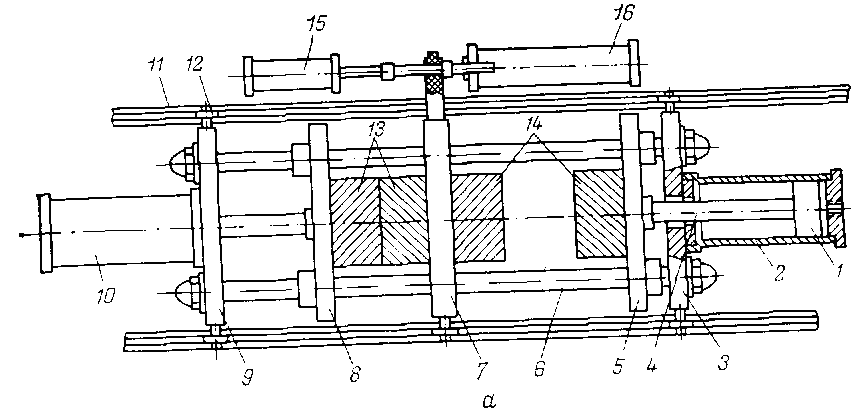 Машина с плоскопараллельным смыканием (рис. 8.12, а) состоит из трех неподвижных плит 3, 7, 9, соединенных двумя или четырьмя колоннами 6, по которым перемещаются подвижные плиты 5 и 8. Перемещение плит осуществляют пневмоцилиндры 2 и 10, установленные на неподвижных плитах 9 и 3. Установленные на плитах полуформы 13 и 14 попеременно открываются и замыкаются в результате перемещения подвижных плит, связанных штоками 4 с поршнями 1 пневмоцилиндров 2. Вся выдувная машина может перемещаться на роликах 12 по направляющим рельсам И. Перемещение машины под экструзионную головку осуществляется при помощи пневмоцилиндра 16. Гидравлический амортизатор 15 обеспечивает необходимую плавность хода и мгновенный останов машины на позиции приема заготовок.