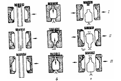 Рис. 8.1 Схема формования полых изделий методом раздува: а— экструзия заготовки; б — раздув; в — выгрузка готового изделия; / — подача воздуха сверху; // — подача воздуха снизу; 111 — подача воздуха через дутьевую иглу.