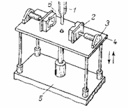 Рис.8.11 Принципиальная схема однопозиционной машины с подвижным столом:/ — головка; 2 — плита с полуформой: 3 — пневмоцилиндр перемещения полуформы; 4 — подвижный стол; 5 —станина; 6 — заготовка