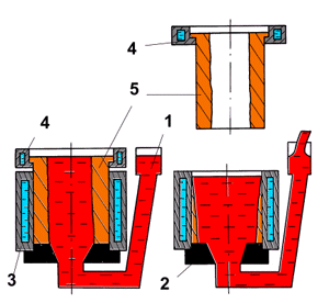 Сущность процесса заключатся в том, что жидкий металл из разливочного ковша через металлопровод 1 и соединительный стакан 2 подают в водоохлаждаемый кристаллизатор 3. Образовавшуюся трубную отливку 5 циклически извлекают вверх при помощи подвижной части кристаллизатора 4. Отличительной особенностью этой схемы является сифонный подвод металла к кристаллизатору, отсутствие стержня и извлечение отливок вверх.