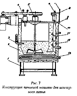Каркас 1 литьевой машины изготовлен из уголковой стали и обшит стальным листом толщиной 1,5 мм. К каркасу крепится стальная плита 9, на которой осуществляется монтаж основных сборочных единиц: шликерного бака 2, механизма прижима пресс-формы 6, ограждение 7, электромагнитного клапана 4, контактного термометра 3, механической мешалки 5 с электродвигателем, блока электрического управления (на рис. 7 он не показан).