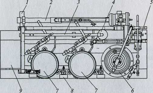 1 — рама; 2 — всасывающий коллектор; 3 — нагнетательный коллектор; 4 —