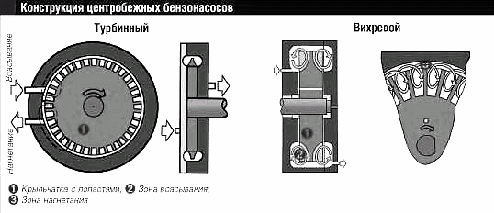 Центробежные насосы делятся на турбинные и вихревые, а нагнетающим элементом у них служит крыльчатка с лопастями различной конфигурации. Если лопасти плоские - перед нами представитель турбинных насосов. Максимальное давление, развиваемое этими насосами, не превышает 4 атм., а КПД - 10-15%, однако они отличаются стабильным потоком и работают практически без пульсаций давления. Используются обычно в качестве первой ступени многоступенчатых насосных систем распределенного и центрального впрыска.
