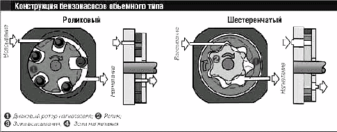Работа насосов объемного типа основана на циклическом изменении объемов всасывающей и нагнетающей полостей. Например, у бензонасосов фирмы Bosch гидронагнетатель - роликовый. Он имеет диск с пятью прорезями, в каждой из которых находится цилиндрический ролик. Диск расположен на одной оси с электромотором, но смещен (эксцентричен) по отношению к обойме нагнетателя, внутри которой он вращается. Ролики играют роль подвижных уплотнений между секциями ротора и обоймой. При вращении каждая секция ротора за счет эксцентриcитета увеличивает свой объем в зоне забора топлива. Создается разрежение, которое способствует засасыванию бензина в насос.