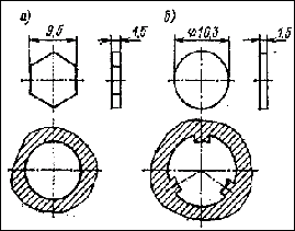 Рисунок 1. Всасывающие клапаны бензонасоса: а - шестиугольный; б - круглый (материал - текстолит листовой; под клапанами показаны сечения колодцев, в которых они размещены)